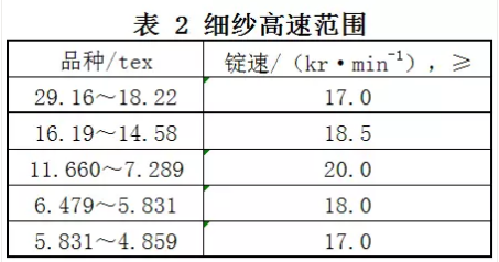 a)品種不同,其速度范圍不同。以純棉機織紗為例,達到以下錠速應(yīng)屬高速范圍,見表2。