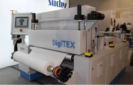 德國(guó)suchy公司推了一款名為DigiTEX的數(shù)碼整理設(shè)備,目前還處于測(cè)試完善階段。該機(jī)采用電腦控制,最高運(yùn)行速度可達(dá)100m/min,在60m/min的線速度下每平米織物上可施加120g的化學(xué)品。噴射系統(tǒng)采用按需噴射模式,噴頭允許的工作液類型包括水性、UV和溶劑型,黏度范圍10~50mPa·s,pH值5~10,烘干單元可選擇紅外、UV或熱風(fēng)烘干。