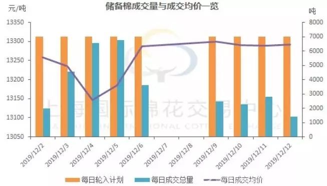 12月12日新疆棉輪入上市數量7000噸,實際成交1400噸,成交率20%,平均成交價格13292元/噸。自12月2日,儲備棉輪入以來,實際成交率不高。國家對收儲質量要求較高,導致高質量棉花市場升水。收儲政策從來不是市場底部支撐,較高收儲只有在成交定量之后才對市場有實質性支撐作用,需要時間過度,一般需要兩三個季度調節(jié)。