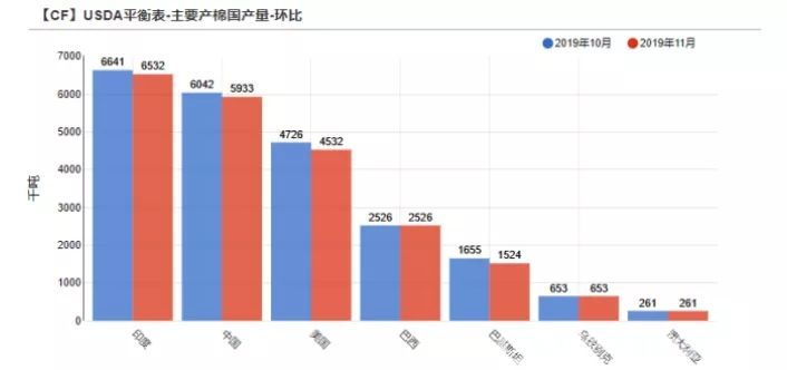USDA在11月報告中大幅下調2019/2020年度棉花產量61.7萬噸。其中印度減產10.9萬噸,中國減產10.9萬噸,美國減產19.4萬噸,巴基斯坦減產13.1萬噸。全球期末庫存下調2.3%至66.4%,棉花供給端壓力減輕。