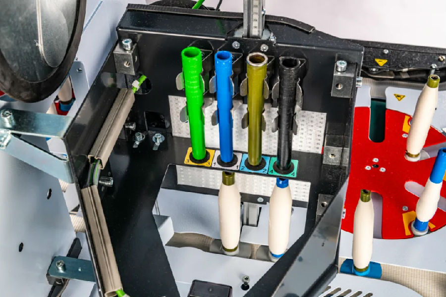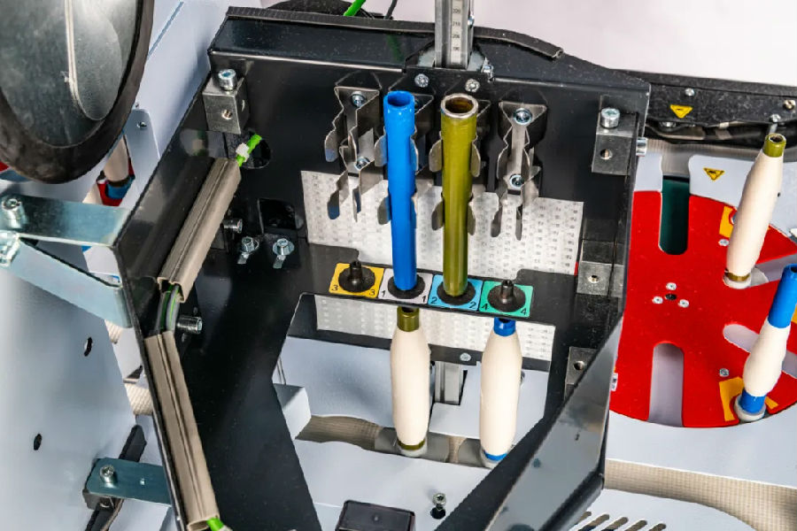 管色檢查以非接觸式方式運(yùn)行,無需停止智能托盤。在進(jìn)料期間,彩色攝像系統(tǒng)不斷地將紗管顏色與分配的智能托盤中的RFID數(shù)據(jù)進(jìn)行比對(duì)。這可以保證紗線質(zhì)量,并使產(chǎn)能始終處于高水平。最多可同時(shí)處理四種不同顏色的紗管。