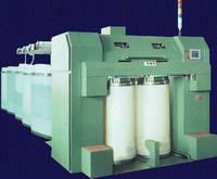 上圈條盤采用空間曲線斜管,對(duì)調(diào)整轉(zhuǎn)動(dòng)的盤狀部件增強(qiáng)剛性并化,部件組裝后進(jìn)行動(dòng)平衡校正,適應(yīng)高速,成形良好。曲線斜管采用進(jìn)口液體擠壓拋磨機(jī)處理,達(dá)到內(nèi)孔光潔順暢。圈條盤采用懸掛式結(jié)構(gòu),使用超輕型滾動(dòng)軸承和標(biāo)準(zhǔn)同步帶。下圈條傳動(dòng)通過(guò)兩級(jí)V帶輪傳到地軸,通過(guò)變換V帶輪滿足各種直徑條筒的成型需要。