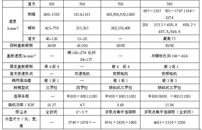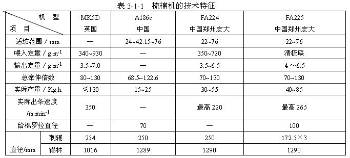 國產(chǎn)梳棉機的發(fā)展經(jīng)過了三個大的發(fā)展階段,50年代,我國自行設(shè)計生產(chǎn)了1系列彈性梳棉機(代表機型1181),結(jié)束了不會制造的歷史。在以后不斷的探索改進中,又研制出了A系列金屬針布梳棉機(代表機型A186C),在20世紀80年代后期,消化吸收了國外的新技術(shù),研制出了新一代的FA系列梳棉機,并使機型趨向多樣化,如表3-1-1所示。