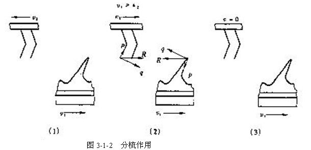 (一)分梳作用  兩針面的針齒相互平行配置,彼此以本身的針尖迎著對方的針尖相對運動,則可得到分梳作用,如圖3-1-2所示。由于兩針面的隔距很小,故由任一針面攜帶來的纖維都有可能同時被兩個針面的針齒所握持而受到兩個針面的共同作用。此時纖維和針齒間的作用力為R,R可分解為平行于針齒工作面方向的分力P及垂直于針齒工作面方向的分為q,前者使纖維沿針齒向針內(nèi)運動,后者使纖維壓向針齒,無論對哪一針面來說,在P力作用下,纖維都有沿針齒向針內(nèi)移動的趨勢。因此,兩個針面都有握持纖維的能力,從而使纖維有可能在兩針面間受到梳理。