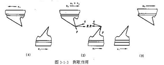 (二)剝?nèi)∽饔?nbsp; 兩針面針齒的方向交叉配置,且一個針面的針尖沿另一針面針齒的傾斜方向運動,則前一針面的針齒從后一針面的針齒上剝?nèi)±w維,完成從一個針面向另一個針面轉(zhuǎn)移纖維的作用,這種作用稱為剝?nèi)∽饔,如圖3-3所示。在圖3-1-3(1)、(2)中,針面1的針尖沿針面2的針齒傾斜方向運動,因兩針面相對運動對纖維產(chǎn)生分梳力R。將R分解為平行于針齒工作面方向的分力P和垂直于針齒工作面方向的分力q。對針面Ⅰ來說,纖維在分力q的作用下有沿針齒向針內(nèi)移動的趨勢;對針面Ⅱ來說,纖維在分力p的作用下有沿著針齒向外移動的趨勢,所以針面Ⅱ握持的纖維將被針面Ⅰ所剝?nèi) 6趫D3-1-3(3)中,則是針面Ⅱ剝?nèi)♂樏姊裆系睦w維。因此,在剝?nèi)∽饔弥,只要符合一定的工藝條件,纖維將從一個針面完全轉(zhuǎn)移到另一個針面。