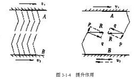(三)提升作用  如兩針面的針齒配置和分梳作用相同,但相對速度的方向與之相反,即一個針面的針背從另一個針面的針背上超越時,兩針面的作用為提升作用。如圖3-1-4所示。從受力分析可知,沿針齒工作面方向的分力p指向針尖,表示纖維將從針內(nèi)滑出。若某針面內(nèi)沉有纖維,在另一針面的提升作用下,纖維將升至針齒表面。