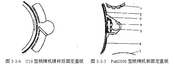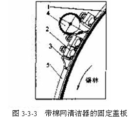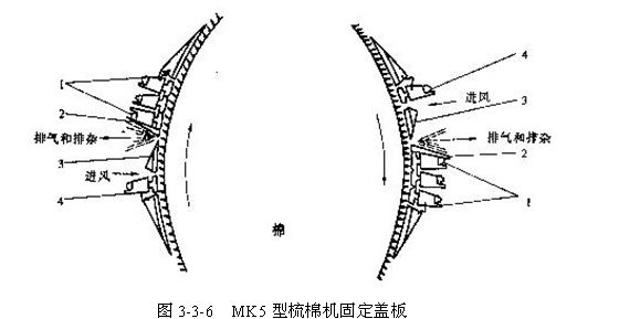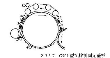 固定蓋板若配以除塵刀及吸風系統(tǒng)(棉網(wǎng)清潔器),則進一步加強了梳棉機對雜質、短絨、微塵的排出作用,使生條質量大為改觀。如圖3-3-3所示。