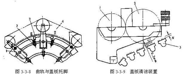 (六)錫林、墻板和蓋板清潔裝置  錫林墻板為一圓弧形鐵板,和錫林軸承為一體,固定于錫林兩側的機框上,其上安裝有曲軌,弓板蓋板調節(jié)支架,抄磨針托架和調節(jié)刺輥、道夫的螺釘?shù)炔考?BR>    曲軌3是由生鐵制成的弧形鐵軌,裝在墻板上,左右各一根,其表面光滑并具有彈性,蓋板在其上緩慢滑行,其上有短軸和槽孔,利用托腳1及其螺栓裝在墻板上,可借調節(jié)螺絲2來調節(jié)曲軌的高低位置,以改變蓋板與錫林間的隔距,如圖3-3-8所示。