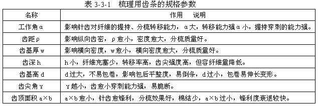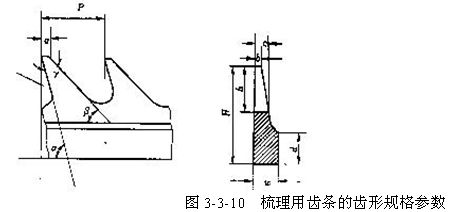 (七)針布  針布有金屬針布和彈性針布兩大類。金屬針布也稱為梳理用齒條,其使用范圍非常廣泛,在棉紡生產(chǎn)中的開清棉、梳棉、精梳及一些新型紡紗(如轉杯紡、渦流紡)設備上均有應用。梳理用齒條的主要規(guī)格參數(shù)見圖3-3-10、表3-3-1。