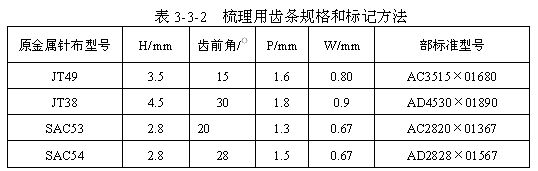 梳理用齒條型號的標記方法由適紡纖維類別代號,齒總高,齒前角、齒距,基部厚度和基部橫截面代號順序組成。適紡纖維類別代號棉纖維為A、毛纖維為B、麻纖維為C、絲纖維為D;被包卷部件代號錫林為C、道夫為D、刺輥為T固定蓋板為G、剝棉羅拉為S。梳棉機梳理用齒條有兩種不同的標記方法,一種為廠家標記,一種為標準標記,如表3-3-2所示。