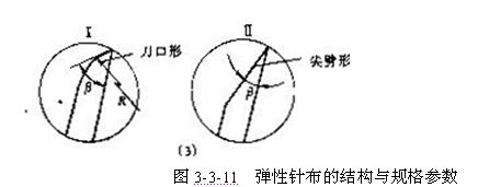 梳針有兩種形式,一種為彎膝狀,一種為直腳狀,直腳梳針在分梳時受分梳力的作用易向后傾仰,使針尖沿弧狀升起,引起兩針面間的隔距變化,故需增強底布握持力和梳針剛度來減少后仰角。彎膝狀梳針可利用下膝部分后仰使針尖降低以抵消部分后仰引起的針尖升高。梳針有不同的規(guī)格、不同的截面形狀,可供使用者選擇。
