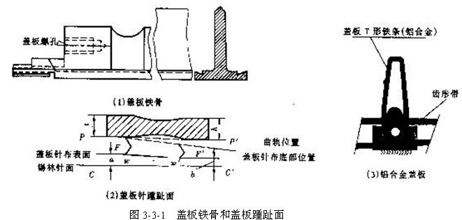 活動蓋板由蓋板鐵骨和蓋板針布組成,蓋板鐵骨1是一狹長鐵條,工作面包覆蓋板針布。為了增加剛性,保證蓋板,錫林兩針面間隔距準確,蓋板鐵骨呈“T”形,且鐵骨兩端各有一段圓脊,相當于鏈條的滾子,以接受蓋板機構的推動。蓋板鐵骨兩端的扁平部擱在曲軌上,曲軌支持面叫踵趾面2。如圖3-3-1所示,為使每根蓋板與錫林兩針面間的隔距入口大于出口,踵趾面與蓋板針面不平行,所以扁平部截面的入口一側(趾部)較厚,而出口一側(踵部)較薄,這種厚度差叫踵趾差。踵趾差的作用是使蓬松的纖維層在錫林蓋板兩針面間逐漸受到分梳。國產(chǎn)梳棉機的踵趾差一般在0.56 mm。