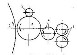 (四)四羅拉剝棉裝置   四羅拉剝棉裝置如圖3-4-2所示.該裝置有一個較大直經(jīng)的剝棉羅拉3和一個轉(zhuǎn)移羅拉4、兩個軋輥5,剝棉羅拉和轉(zhuǎn)移羅拉表面包卷有山形齒,對纖維的作用相同。四羅拉剝棉裝置的剝?nèi)≡砼c三羅拉相同。剝棉裝置均配置有防返花裝置,因機型不同而各異。圖中防返花裝置為一兩端裝有限位開關的絨輥2,由剝棉羅拉傳動,當絨輥因繞花上抬到一定位置時,通過控制桿推動限拉開關使機器停轉(zhuǎn),以保護金屬針布,避免扎壞。