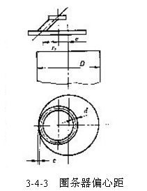 ⒈偏心距  圈條斜管齒輪與底盤兩回轉(zhuǎn)軸線之間的垂直距離,即條筒中心與圈條中心的距離稱為偏心距,如圖3-4-3所示.偏心距的大小根據(jù)條筒直經(jīng)、棉條圈放半經(jīng)及氣孔大小等決定的。