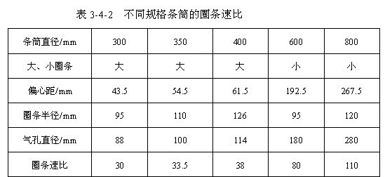 從圖上可知,底盤一轉(zhuǎn),偏心距e轉(zhuǎn)過的孤長為2πe,即圈條中心繞條筒中心回轉(zhuǎn)1周,圈條斜管轉(zhuǎn)過的圈數(shù)為2πe/d。即圈條速比i=2πe/d。由此可見,當棉條直徑一定時,圈條速比隨偏心距e的增加而增大。同時,圈條器速比也與條筒直徑等因素有關。不同規(guī)格條筒的圈條速比見表3-4-2。
