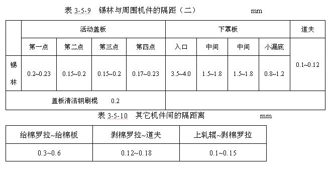 梳棉機各部隔距應(yīng)根據(jù)具體工藝選擇,選擇范圍見表3-5-7、表3-5-8、表3-5-9、表3-5-10。