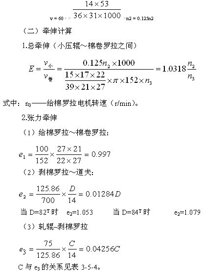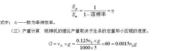 ⒊實際牽伸倍數(shù)  按輸出與喂入機件的表面線速度之比求得的牽伸倍數(shù)為機械牽伸倍數(shù)(也稱理論牽伸倍數(shù));按喂入半制品定量與輸出半制品定量之比求得的牽伸倍數(shù)稱為實際牽伸倍數(shù)。因為梳棉機有一定的落棉,所以實際牽伸倍數(shù)大于機械牽伸倍數(shù),二者的關(guān)系式為: