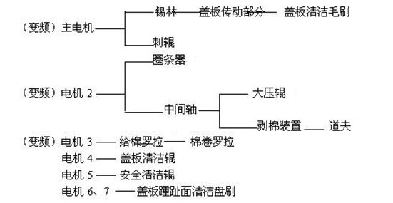 2.喂入部分由變頻電機傳動,可無級調(diào)速,由鏈條傳至給棉羅拉,再傳至棉卷羅拉。