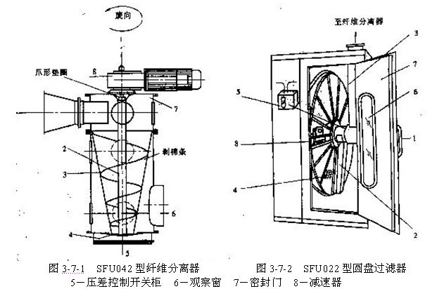 (1)纖維分離器和粉塵緊壓器  纖維分離器的作用是收集和壓縮塵流中的纖維和雜質(zhì)。結(jié)構(gòu)如圖3-7-1所示。含纖維塵流由入口1進入纖維分離器,