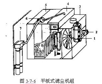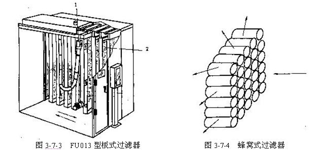 (3)板式過濾器  板式過濾器主要用于過濾細小的粉塵,主要作為第二級過濾設(shè)備。它與纖維分離器,圓盤式過濾器可組成了二級過濾系統(tǒng)。與集塵器組合,可直接用于回風(fēng)過濾。板式過濾器的結(jié)構(gòu)結(jié)圖3-7-3所示.。為了在一定空間具有較大的過