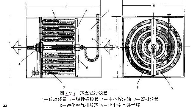 (5)環(huán)套式過濾器  如圖3-7-5所示,環(huán)套式過濾器也屬于第二級過濾器,由四組八只直經(jīng)大小不同的圓籠過濾單體以同心環(huán)套的方式組裝而成,由一級過濾器排入的含粉塵空氣分別進入大小不同的圓籠形成的過濾單體3,在通過內(nèi)外濾籠時,將粉塵阻留在長毛絨濾料上,而排出凈化空氣。在長軸絲杠的驅(qū)動下,梳篦式吸嘴2既旋轉(zhuǎn)又往復(fù)運動,清吸掉附著在濾料上的粉塵,經(jīng)粉塵緊壓器壓實成塊狀后收集。分離后的空氣被再排回濾塵箱體內(nèi)過濾。