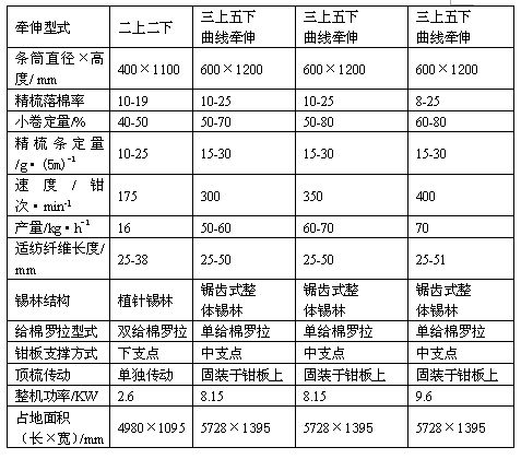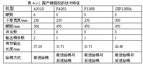 1958年上海國棉二廠參照國外精梳機(jī),設(shè)計制造了我國第一臺精梳機(jī),命名為紅旗牌精梳機(jī)。20世紀(jì)60年代初期,研制了A201型及A201A型精梳機(jī),車速為116鉗次/分,從而結(jié)束了我國不能生產(chǎn)精梳機(jī)的歷史。到了20世紀(jì)70年代,針對A201A型精梳機(jī)分離羅拉傳動機(jī)構(gòu)中存在的磨損大、振動大等問題進(jìn)行了改進(jìn),出現(xiàn)了A201B型精梳機(jī);之后將A201B型精梳機(jī)的單筒雙條改為雙筒單條及分離羅拉傳動機(jī)構(gòu)的改進(jìn),更名為A201C型精梳機(jī),車速為145鉗次/分。20世紀(jì)70年代末,通過對引進(jìn)設(shè)備的消化吸收,于80年代初研制開發(fā)了FA251型精梳機(jī),車速為180鉗次/分。同時又對A201C型精梳機(jī)進(jìn)行了多項改進(jìn),設(shè)計制造了A201D型精梳機(jī),車速為165鉗次/分。20世紀(jì)90年代初,上海紡織機(jī)械總廠對FA251型精梳機(jī)進(jìn)行了八項技術(shù)改進(jìn),發(fā)展成為FA251B型精梳機(jī),車速達(dá)到180鉗次/分。1991年到1993年相繼開發(fā)了FA261型、SXFA252型精梳機(jī),車速為300鉗次/分。到了1998年以后以相繼開發(fā)了PX2、FA266、F1268、SXF1269型精梳機(jī),精梳機(jī)的速度提高到350鉗次/分,到2002年我國以開發(fā)了SXF1269A、F1268A、FA269型精梳機(jī),最高車速達(dá)到了400鉗次/分;我國精梳機(jī)的加工制造水平與世界先進(jìn)水平的差距正在縮小。幾種國產(chǎn)精梳機(jī)的技術(shù)特征見表4-1-1。