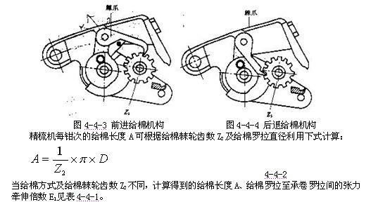 2、給棉羅拉   SXF1269A等新型精梳機(jī)均采用單給棉羅拉機(jī)構(gòu),與雙給棉羅拉機(jī)構(gòu)相比,對須叢的抬頭、棉網(wǎng)的分離接合及精梳機(jī)的高速有利。在新型精梳機(jī)上,有兩種給棉方式;一種是鉗板在前擺過程中給棉,稱為前進(jìn)給棉;另一種是后擺過程中給棉,稱為后退給棉。精梳機(jī)的給棉方式不同,則給棉機(jī)構(gòu)亦不同。