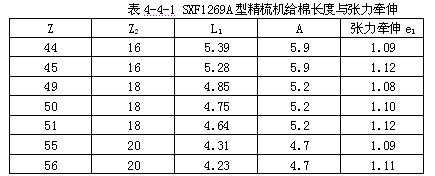 式中:Z為給棉羅拉至承卷羅拉間的張力牽伸變換齒輪齒數(shù),在SXF1269型精梳機(jī)上,Z有44、45、49、50、51、55、56七種供選用,計(jì)算得到承卷羅拉的給棉長度、給棉羅拉至承卷羅拉間的張力牽伸倍數(shù)見表4-4-1。
