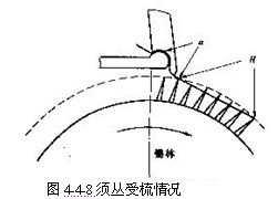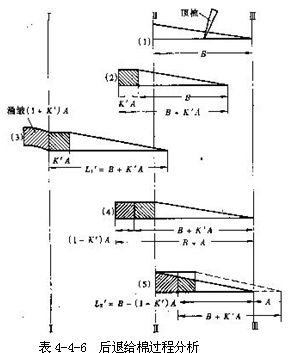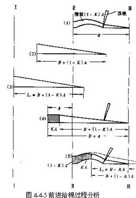 3、后退給棉過程分析    后退給棉過程如圖4-4-6所示,圖中的符號意義和圖4-4-5相同。在后退給棉過程中,須叢的涌皺不受頂梳插入的影響,而是受鉗板閉合的影響。