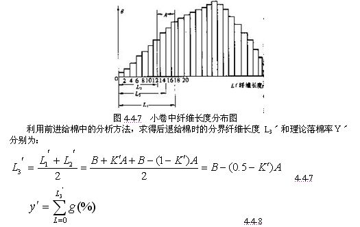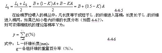 3、理論落棉率    對于前進(jìn)給棉而言,進(jìn)入落棉的最大纖維長度為L1,  而進(jìn)入棉網(wǎng)的最短纖維長度分別為L2,則長度介于L1和L2之間的纖維既可進(jìn)入落棉又可進(jìn)入棉網(wǎng),為計(jì)算方便,選用它們的中間值L3為分界纖維長度,則: