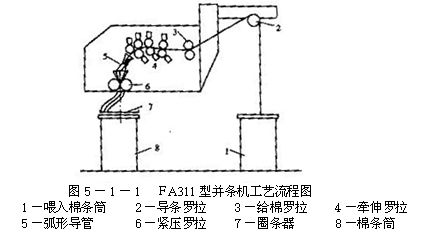 如圖5-1-1所示為國產(chǎn)FA311型并條機的工藝過程。棉條筒1放在并條機機后導條架的兩側,每側放置6~8個條筒。條子自條筒引出,通過導條架上的導條羅拉2積極喂入,經(jīng)過給棉羅拉3后再經(jīng)過塑料導條塊聚攏,平齊地進入牽伸裝置,經(jīng)過牽伸后喂入的條子被拉成薄片,然后由導向輥送入兼有集束和導向作用的弧形導管5和喇叭口聚攏成條后由緊壓羅拉6壓緊成光滑緊密的棉條,再由圈條器7將棉條有規(guī)律的盤放在棉條筒8內(nèi)。為了防止在牽伸過程中短纖維和細小雜質粘附在羅拉和皮輥表面,高速并條機都采用上下吸風式自動清潔裝置,由上下吸風罩、風道、風機、濾棉箱和羅拉自動揩拭器等組成。為了減輕勞動強度,一般都設有自動換筒裝置。