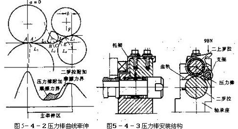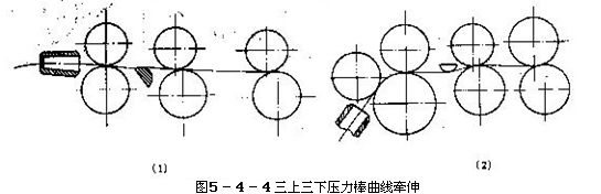 (2)上托式壓力棒  即壓力棒在下須條在上,壓力棒向上托起須條程屈曲狀,增加對(duì)纖維的握持。由于壓力棒處于須條下部,解決了壓力棒積花現(xiàn)象,結(jié)構(gòu)簡(jiǎn)單,操作方便。但當(dāng)棉網(wǎng)高速運(yùn)動(dòng)向上的沖力較大時(shí),壓力棒對(duì)須條的控制作用較差,不適宜高速。如圖5-4-4(1)為上托式壓力棒。