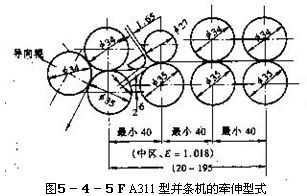 (2)四上四下附導(dǎo)向輥、壓力棒雙區(qū)曲線牽伸: 國(guó)產(chǎn)FA311型并條機(jī)牽伸形式為四上四下附導(dǎo)向輥、壓力棒雙區(qū)曲線牽伸,如圖5-4-5
