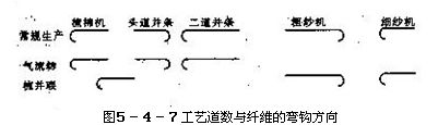 (一)并條機(jī)的道數(shù)  主要是考慮到牽伸對(duì)伸直后彎鉤纖維有利,在普梳紡紗系統(tǒng)的梳棉和細(xì)紗之間工藝道數(shù)應(yīng)符合“奇數(shù)原則”。如圖5-4-7所示