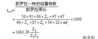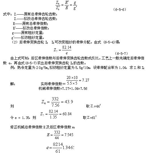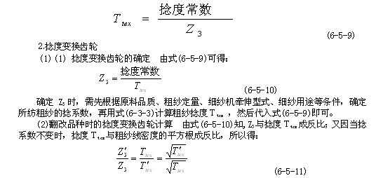 (1)總牽伸變換齒輪Z4  Z4與總牽伸倍數(shù)E成反比,欲求Z4時,先根據(jù)喂入棉條定量及擬紡粗紗定量,計算出所需的實際牽伸倍數(shù),再用配合率求出機械牽伸倍數(shù)E,然后代入式(6-5-4 ) 中即可。在熟條定量不變的情況下,翻改紗特時,可按下式計算Z4: