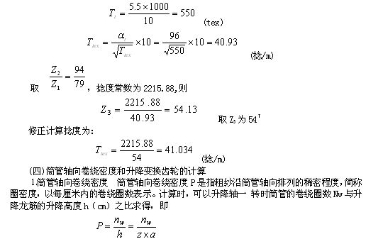 (3)升降齒輪  升降齒輪用于調(diào)節(jié)粗紗在筒管軸向排列的疏密程度,改變升降齒輪的齒數(shù),即改變了升降龍筋的升降速度和粗紗的卷繞圈距。