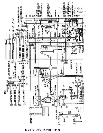 ⒉粗紗機的傳動系統(tǒng)  粗紗機的傳動系統(tǒng)因機型而異,現(xiàn)以由機電化向智能化的過渡機型——FA425型粗紗機為例,其傳動系統(tǒng)如圖6-5-1所示。