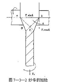 紗條的加捻,其實(shí)質(zhì)就是利用須條橫截面間產(chǎn)生相對角位移,使原來伸直平行的纖維與紗軸發(fā)生傾斜來改變須條結(jié)構(gòu)。紗條由扁平狀形成近似的圓柱形。如圖7—3—2所示,前羅拉輸出的須條呈扁平的狀態(tài),纖維與紗軸平行排列。鋼絲圈回轉(zhuǎn)產(chǎn)生的捻回向前羅拉鉗口傳遞,使鉗口處的須條圍繞軸線回轉(zhuǎn),須條寬度逐漸收縮,兩側(cè)也逐漸折疊而卷入紗條中心,形成加捻三角區(qū)。在加捻三角區(qū)中,須條的寬度和截面發(fā)生變化,從扁平狀逐漸形成近似圓柱形的細(xì)紗。
