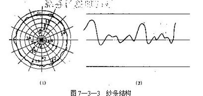 須條加捻時,產(chǎn)生了纖維的內(nèi)外層轉(zhuǎn)移。如圖7—3—2所示,設(shè)紗條截面上纖維根數(shù)為n,各根纖維與紗條輸出軸向的夾角為θi,在紡紗張力TS作用下,每根纖維受到張力Tisinθi,其軸向按平衡條件有  ∑Ticosθi=TS,其徑向產(chǎn)生向心壓力為Tisinθi,邊纖維θi大,Tisinθi大,中心纖維θi接近于0,Tisinθi接近于0。因此,從加捻三角區(qū)中纖維的幾何位置和紡紗張力所產(chǎn)生的力學(xué)條件迫使邊纖維擠向中心,把中心纖維擠向外緣。當(dāng)邊緣纖維擠入中心后,其向心壓力趨于零,又被另一些外緣纖維擠出來,一根纖維往往從外向內(nèi),又從內(nèi)到外,發(fā)生內(nèi)外層纖維反復(fù)轉(zhuǎn)移,因此,紗條中纖維的實(shí)際幾何形狀如圖7—3—3所示。圖(1)是紗條中一根纖維相隔0.2mm切片上各點(diǎn)橫截面投影。