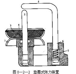 墊圈式張力裝置如圖8—2—2所示,由兩片圓盤形張力盤1和芯軸2所組成,在上張力盤內(nèi)裝有毛氈墊圈3和張力墊圈4。紗線在上下兩片張力盤之間通過時(shí),由于張力盤與紗線的摩擦作用,上張力盤及張力墊圈隨著紗線的前進(jìn)而回轉(zhuǎn),紗線上落下的塵屑被拋出,同時(shí)由于摩擦阻力而使紗線具有一定的張力。毛氈墊圈的作用是吸收上張力盤和張力墊圈在高速轉(zhuǎn)動(dòng)時(shí)的震動(dòng),使紗線張力均勻,從而得到良好的成形。
