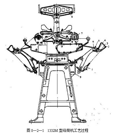 1332型槽筒式絡(luò)筒機(jī)的工藝過程如圖8—2—1所示。紗線自管紗(線)1退繞下來,經(jīng)導(dǎo)紗桿2引入導(dǎo)紗板凳,再經(jīng)過圓盤張力器和清紗板5的縫隙以及張力桿6引入槽筒7的溝槽。由于槽筒摩擦傳動(dòng)筒子回轉(zhuǎn)和溝槽的往復(fù)導(dǎo)紗運(yùn)動(dòng),從而使紗線交叉地卷繞在筒子上。