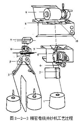 (一).精密卷繞并紗機(jī)的工藝流程  圖8—2—3為精密卷繞并紗機(jī)工藝過程,喂人單紗筒子1放在擱架上,在紗筒之間有隔紗器。紗線由筒子退繞后,經(jīng)過氣圈控制器2、導(dǎo)紗器3,穿過機(jī)械式預(yù)清紗器4、紗線張力裝置6、斷頭探測(cè)器5、切紗與夾紗裝置7,由支撐羅拉10支撐,并由導(dǎo)紗裝置8導(dǎo)向卷繞成精密筒子9。