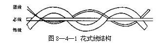 花式紗線一般由三根紗線組成,即芯線、固線、飾線,如圖8—4—1所示,芯線起骨架作用,主要提供紗線的強力,一般選用強力較高的長絲或紗線作為芯線。固線起加固作用,用來固定花形,使花形按生產(chǎn)時的方式固定下來,從而避免沿長度方向滑移。固線大多采用細且強力高的長絲。飾線反映花式效應(yīng),花式紗的花式,如粗細節(jié)、圈圈、小辮子等,均是通過飾線而表現(xiàn)出來。飾線可采用棉條或粗紗經(jīng)相同的牽伸但不同超喂(如圈圈紗),或經(jīng)不同的牽伸來生產(chǎn)(如竹節(jié)紗),也可采用長絲,經(jīng)不同的超喂來生產(chǎn)(如結(jié)子紗)。采用不同顏色的兩根粗紗經(jīng)不同牽伸不同超喂,可生產(chǎn)出粗細變化且顏色變化的花式紗。