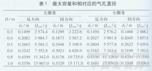 假定w=14 g/m,d=15×10-3m,H=0.91 m,v=10×10-3m,D分別為0.3、0.4、0.5、0.6、0.8和1.0 m時計算大、小圈條分別在同、反方向時的最大容量和相對應(yīng)的do,結(jié)果如表1所示。