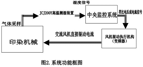該系統(tǒng)采用JCJ200Y高溫型測試裝置,將被測環(huán)境中的氣體通過采樣風(fēng)機采到采樣室,然后通過分析調(diào)理后把濕度信號送中央集中控制儀。中央集中控制儀采用JCJ600P型智能數(shù)字調(diào)節(jié)儀根據(jù)被采集的濕度信號采用模糊控制和PID傳統(tǒng)控制相結(jié)和的方式,輸出以連續(xù)變化的模擬電壓或電流控制信號。該控制信號可直接送到設(shè)備的排氣風(fēng)機的驅(qū)動執(zhí)行機構(gòu)—交流馬達驅(qū)動器(變頻器)。通過調(diào)整變頻器功率負載輸出的頻率的大小來調(diào)整排氣風(fēng)機的轉(zhuǎn)速,以達到對被測環(huán)境的濕度的自動監(jiān)控功能。該系統(tǒng)具有較低的啟動電流、較低地啟動扭力和諧波沖擊(內(nèi)置直流電抗器)等眾多優(yōu)點,能很好的解決機械設(shè)備高能耗,特別是耗電嚴重的問題。  