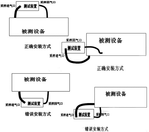 安裝過程一定要注意:測濕裝置的進氣口水平位置一定不低于采樣管與被測環(huán)境對接的接口位置,另外采樣管道要高于該接口;如果被監(jiān)測設(shè)備對密閉性要求不太嚴格,測濕裝置的采樣回氣口可不用把氣體引回到被測設(shè)備,直接排放到空氣中即可。示意圖如下: