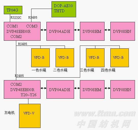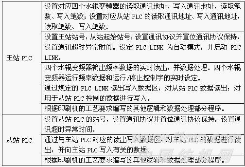 。3)本機設有一個主控制臺電箱和一個主電柜,主控制臺電控箱在輸紙機的操作側,主電柜在傳動側;其中主站PLC在主控制臺電箱里,從站PLC在主電柜里。主站PLC主要用于輸紙機和一二色印刷機組的信號采集及處理。從站PLC主要用于主電機變頻器控制、三四色印刷機組和收紙機的信號采集及處理。主站PLC和從站PLC通過RS-485通訊線連接。主控制臺電箱里還有一二色印刷機組的出水輥變頻器,主電柜里有主電機變頻器和三四色印刷機組的出水輥變頻器。一二色出水輥變頻器和主站PLC采用RS-485通訊線連接和控制。三四色出水輥變頻器和主站PLC采用RS-485通訊線連接和控制。這樣四個印刷機組的出水輥變頻器和從站PLC都作為從站和主站PLC就組成了RS-485通訊網(wǎng)絡。利用臺達PLC的EASY LINK功能可以實行1:N控制。主電機變頻器從安全可靠方面考慮仍采用I/O控制,參見圖1。