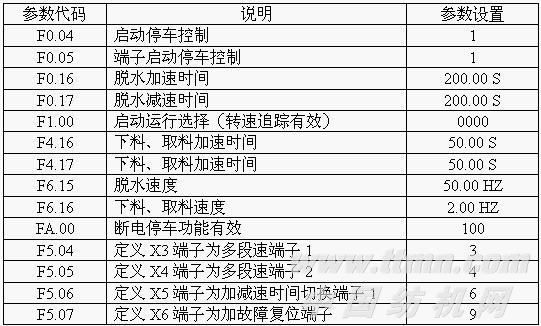 控制回路輸入端子中,RUN端子為正轉(zhuǎn)運(yùn)行端子,F(xiàn)/R端子為反轉(zhuǎn)運(yùn)行端子,X3端子定義為多段速1(正常脫水速度),X4端子定義為多段速2(下料、取料速度),X5端子定義為加減速時(shí)間2(下料、取料加減速時(shí)間),X6端子定義為故障復(fù)位端子。EA、EB、EC為變頻器故障輸出繼電器觸點(diǎn)。