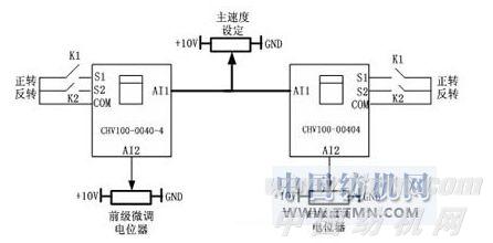 整個加工過程由前級擠壓成型、高溫無縫焊接、后級擠壓成型、切割完成。在啟動控制過程中,需要電機有較大的轉矩輸出,同時,整個運行過程中,對速度的穩(wěn)定精度要求比較高,否則,擠壓成型的鋼管結構不均勻,厚薄不穩(wěn)定,影響產(chǎn)品品質。前級成型和后級成型,都是由CHV100-004-4變頻器(4KW)采用無PG矢量控制的方式進行驅動,兩者的主頻率都由AI1給定,輔助頻率由AI2給定,用主、輔疊加的頻率給定形式進行頻率設定。采用端子控制起停和電機的正反轉。電氣配置圖如下: