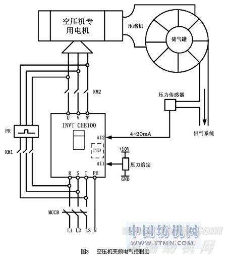 變頻調速系統(tǒng)將管網壓力作為控制對象,裝在儲氣管出氣口的壓力變送器將儲氣罐的壓力轉變?yōu)殡娦盘査徒o變頻器內部的PID調節(jié)器,與壓力給定值進行比較,并根據差值的大小按既定的PID控制模式進行運算,產生控制信號去控制變頻器的輸出電壓和逆變頻率,調整電動機的轉速,從而使實際壓力始終維持在給定壓力。另外,采用該方案后,空氣壓縮機電動機從靜止到穩(wěn)定轉速可由變頻器實現軟啟動,避免了啟動時的大電流和啟動給空氣壓縮機帶來的機械沖擊。正常情況下,空氣壓縮機在變頻器調速控制方式下工作。變頻器一旦出現故障,生產工藝不允許空氣壓縮機停機,因此,系統(tǒng)設置了工頻與變頻切換功能,這樣當變頻器出現故障時,可由工頻電源通過接觸器直接供電,使空氣壓縮機照常工作。